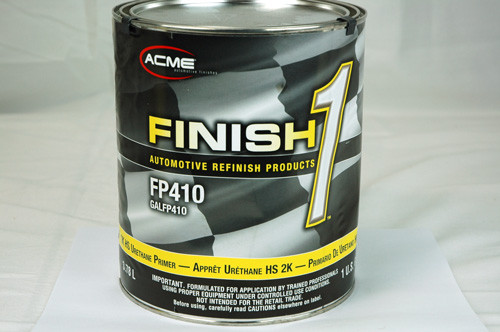 Finish1 FP410 primer offers great value. Applies in 10 minutes and dries in 15-20 minutes. Mix Ratio: 4 parts primer : 1 part activator. Application: Apply 2-3 medium coats, waiting 5-7 minutes between coat. Wait 15-20 minutes and wetsand with 600 grit sandpaper.